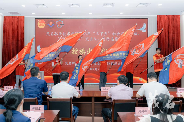 与会领导为茂名职业技术学院入围“推普助力乡村振兴”全国大学生暑期社会实践志愿服务队、广东省“百千万工程”突击队的志愿服务队、茂名职业技术学院“百千万工程”突击队、茂名职业技术学院消防志愿服务队的代表进行授旗。茂名职业技术学院消防志愿服务队接过旗帜,标志着茂名首支高校消防志愿服务队在茂名职业技术学院正式成立。
