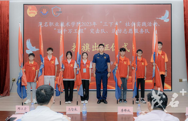 茂名职业技术学院2023年“三下乡”社会实践服务队、茂名职业技术学院“百千万工程”突击队、消防志愿服务队学生代表进行入队宣誓。