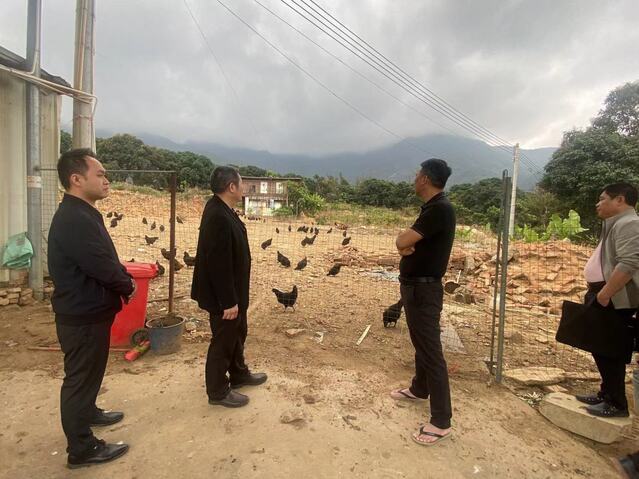 交流活动后,陈旭东一行参观调研了根子镇“一村一品”项目——官垌村的五黑鸡养殖项目和公垌村的仙桃古树群(“仙桃”品牌打造项目)。