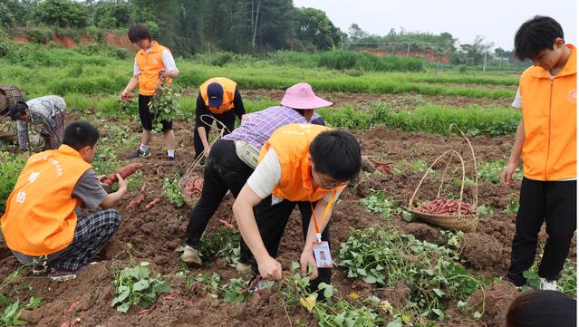 在伦村村甘薯种植试验田里,胡晓敏等教师现场为参加实践的大学生以及种植户上了一堂有趣的“思政+农艺”课,把所学知识运用于生产实践中,在实践中发现问题并努力找到解决问题的答案,彰显广东茂名农林科技职业学院的耕读文化。随后,同学们、老师们卷起袖子,拎起工具,兴高采烈地在田间穿梭,有的负责用锄头刨土、有的负责捡甘薯装筐,大家协助配合、认真负责,呈现出一派农事忙、农业兴的喜人景象。大学生志愿者郭东煜说:此次“百千万工程”突击队行动是我们参与乡村振兴活动中最生动的一课,对于我们涉农专业的大学生具有重要意义,我将更加深刻体会到现代农业发展需要青年力量,作为新时代农林青年,我们应努力学习专业知识,为百县千镇万村高质量发展贡献青春力量。”
