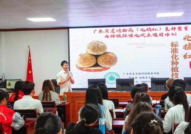 在广东茂名农林科技职业学院援建的培训室内,学院生物技术系高级农艺师罗剑斌、农艺师陈俊为当地化橘红种植户讲授了《化橘红优质苗木繁育技术》和《化橘红标准化种植技术》两门课程,讲授学院农业标准化团队参与起草编制的《化橘红种植技术规程》《化橘红嫁接育苗技术规程》两项地方标准,为当地种植户分享化橘红科学种植的技术经验,面对面指导种植户解决生产中遇到的技术难题。