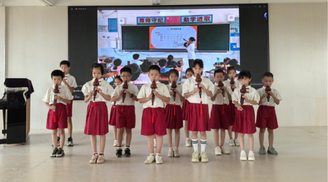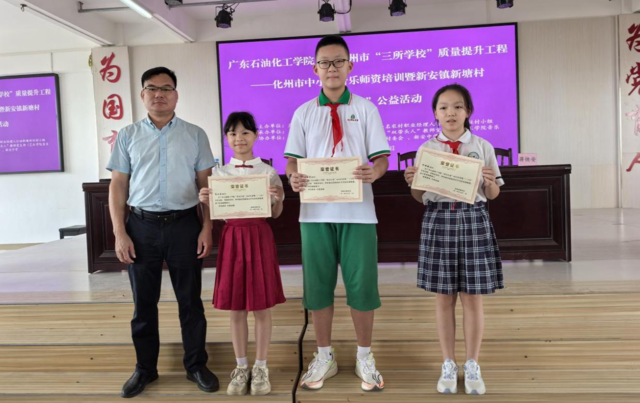 在颁奖环节,该校团委书记冯耀勇和新安中学戴强勇校长表彰了在新南小学支教的该校“美育先锋队”学生以及担任助教的茂名市区小学生,他们的努力和付出得到了认可和鼓励。