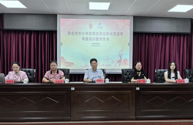 茂名网讯 9月21日,广东石油化工学院纵向帮扶茂名市“三所学校”和县中质量提升暨茂名市中小学美育改革创新优秀成果专题培训活动在市教育局四楼会议室成功举办。省本科学校美育名师工作室主持人、艺术学院副院长蒋快安教授,省名教师工作室主持人陈燕校长,市教育局体卫艺科科长陈光东,以及茂名市近100名大中小学美育骨干教师等参加活动。