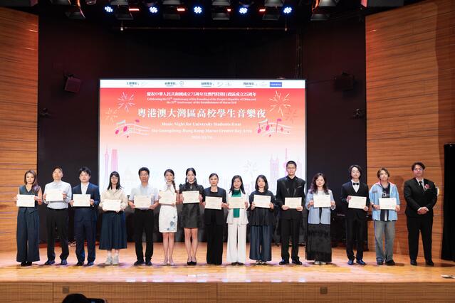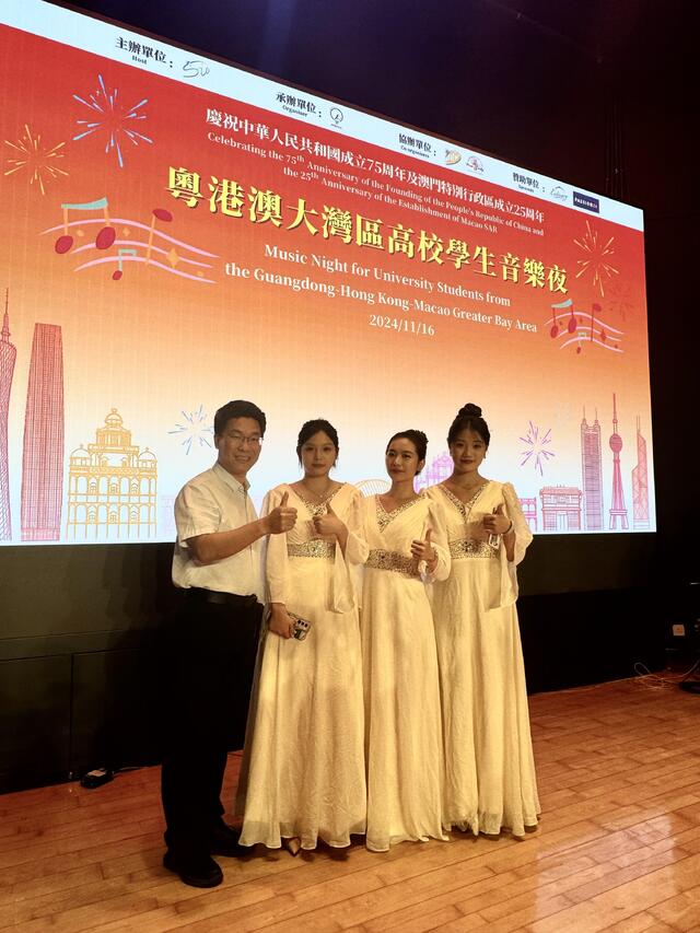 茂名网讯 2024年11月16日,广东石油化工学院应邀参加由澳门旅游大学主办的“庆祝中华人民共和国成立75周年及澳门特别行政区成立25周年之粤港澳大湾区高校学生音乐夜”活动。活动目的在于通过丰富的文化艺术活动加强粤港澳大湾区高校学生之间的友谊,向祖国及澳门特别行政区表达深深的祝福。艺术学院副院长蒋快安教授携我校艺术学院音乐专业学生周李芊、刘嘉婷、谭雅琼三位同学共同参与了此次演出。