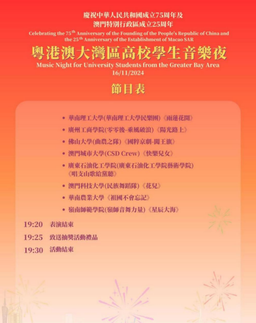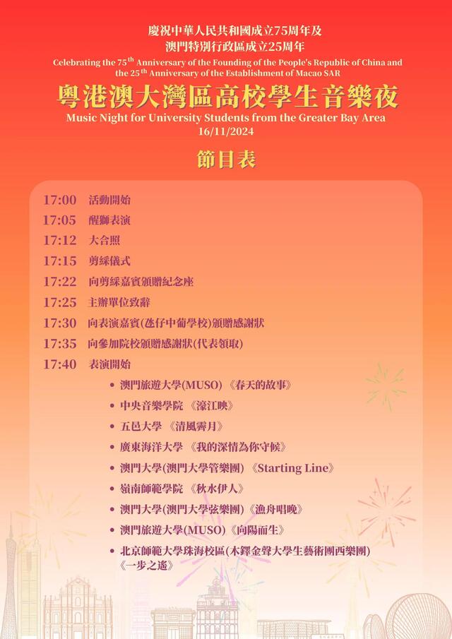 本届“粤港澳大湾区高校学生音乐夜”由澳门旅游大学主办,参与演出的高校包括广东石油化工学院、五邑大学、北京师范大学珠海校区、佛山大学、华南理工大学、华南农业大学、广州工商学院、广东海洋大学、岭南师范学院、澳门大学、澳门旅游大学、澳门科技大学、澳门城市大学等13所高校共59人(包括48名表演学生,11名带队指导老師),16个精彩演出涵盖歌唱、舞蹈、中西乐器演奏、京剧等。学生们用精彩的演出歌颂对祖国的热爱,祝愿伟大祖国繁荣昌盛,祝愿澳门特区未来更加美好,同时对大湾区未来发展充满希望,当天活动线下有逾150人出席,场面热闹、喜庆。