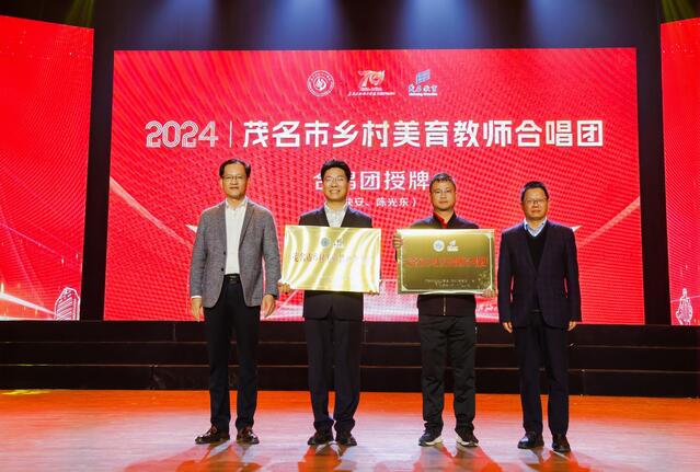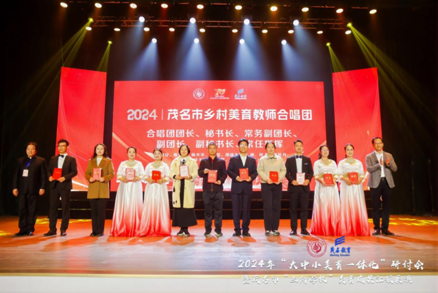 当天下午,茂名市乡村美育教师合唱团的成立仪式在科技会堂隆重举行。广东石油化工学院副校长万勇及茂名市教育局副局长刘广海同志出席,并分别发表了热情洋溢的致辞,共同为合唱团授牌。合唱团的领导及成员也分别接受主办方颁发的聘书。