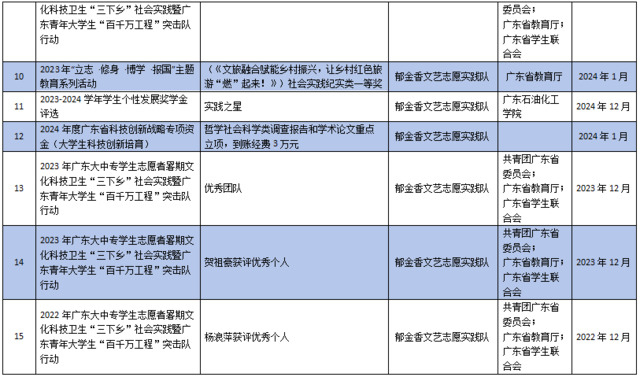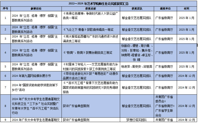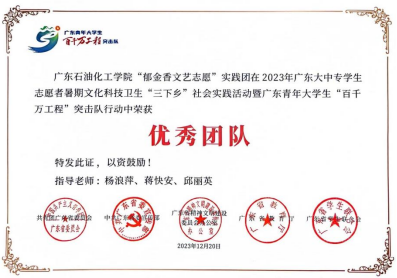 近年来,广油艺术学院坚持党建带团建,紧紧围绕立德树人根本任务,组织优秀文艺青年主动走进乡村、社区和基层,用艺术专业开展理论宣讲、国情观察、生态文明建设以及民族团结等美育社会实践行动,产生了积极的社会影响,展现了新时代艺术学子良好精神风貌,美育实践成果突出,郁金香文艺志愿实践队等学生累计获得15个省级荣誉,其中一等奖3个,优秀团队(调研报告)3次,学生实践成果受到广东学联、南方+、茂名共青团等众多媒体报道。学院师生团队持续为茂名市各镇村开展文艺志愿服务,制作优质精良的文艺作品,讲好茂名故事,传递茂名好声音。未来,将继续引导学生把论文写在乡村大地上,让美育之花处处开放。