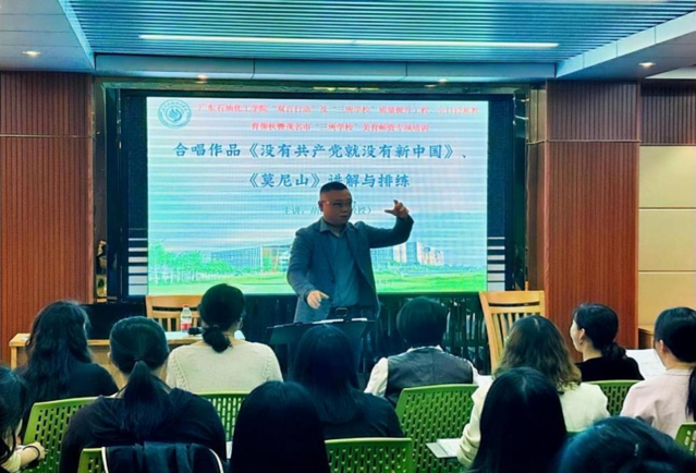《合唱指挥艺术与实践》工作坊中,支部党员教师胡洋设计“红色经典传唱”模块,带领参训教师在《没有共产党就没有新中国》合唱编排中,实践党建理念,通过“理论讲解-动作分解-实践演练”三维教学模式,深入讲解声部平衡、情感表达等核心技巧。