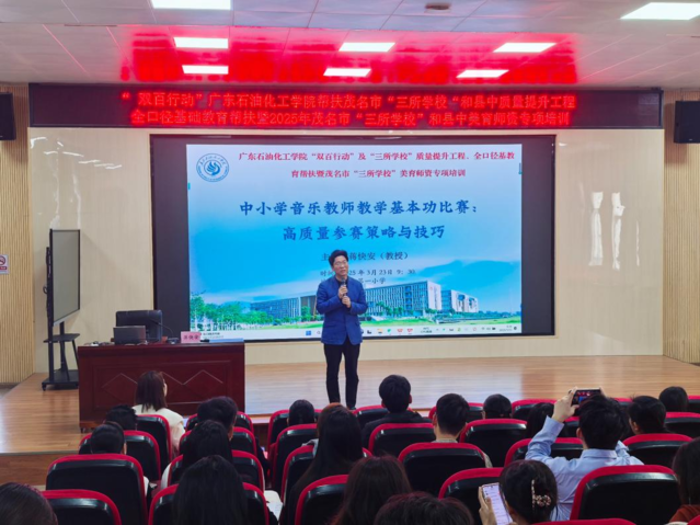 3月23日,全省高校“双带头人”教师党支部书记“广东行”专项行动在茂名取得丰硕成果。作为第五批全省党建工作样板支部培育创建单位,广东石油化工学院音乐表演公共艺术教师联合党支部携手茂名市教育局,开展“双百行动”、纵向帮扶茂名市“三所学校”及县中质量提升活动。活动由音乐表演公共艺术教师联合党支部牵头策划,依托全省高校“双带头人”教师党支部书记“广东行”专项行动以及广东省本科学校蒋快安美育名师工作室的智力资源,推动全市 120 余名乡村教师通过“理论提升—实践创新—党建引领”的三阶培养路径,实现了专业能力与党性修养的双提升。