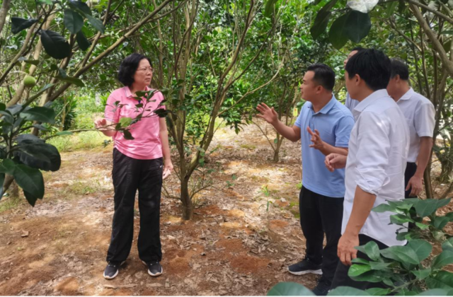 活动当天,董艳清一行前往平定镇积田村了解化橘红标准化种植示范基地建设情况,实地观摩化橘红种植园,与当地相关种植人员沟通交流。学校专家们深入了解化橘红种植的选址、种植环境要求、管理过程、采摘果实的大小等,交流探讨如何通过标准化流程提升产品质量,为化橘红产业升级提供科学依据。随后董艳清一行到那宾村委会,详细了解化橘红生成加工、农户合作模式、村集体收入、强村公司成立及新媒体运营等情况,并召开了校镇结对共建交流会。