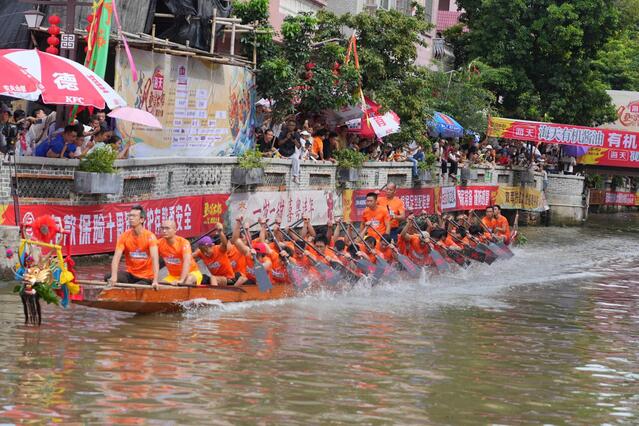 叠滘水乡位于佛山市南海区桂城街道,叠滘水道纵横交错、浅窄多弯,平均宽度约6米、最窄处仅3米,特殊的地形催生了独特的“弯道漂移”技艺——25米龙船搭载40名桨手,在S形、L形河道中高速过弯,舵手需精准控船,桨手划桨、侧身、压船,稍有不慎就会“煲船”(“煲烂”一词,在叠滘方言中意为“撞烂”)。