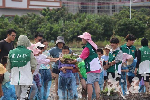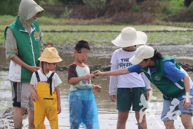 烈日下,团队成员和孩子们走进分界镇白石岗的一片水田之中,“插秧要注意前后间隔20公分,深浅适度,株距均匀。”在队员的讲解和示范之下,孩子们认真学习,亲身体验“面朝黄土背朝天”的农耕艰辛,家长们也纷纷用照片、视频记录此刻美好劳动瞬间。