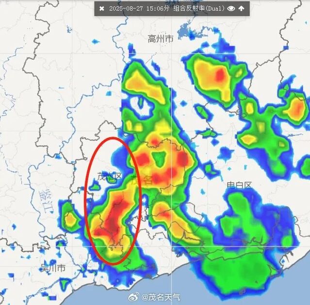 受强对流云团影响,预计未来3小时茂南区、高新区将有强雷暴、短时强降水、局地9级左右短时大风等强对流天气,茂名市气象台2025年8月27日15时44分将茂南区、高新区雷雨大风黄色预警信号升级为橙色,滨海新区雷雨大风黄色预警信号继续生效,请注意防御。