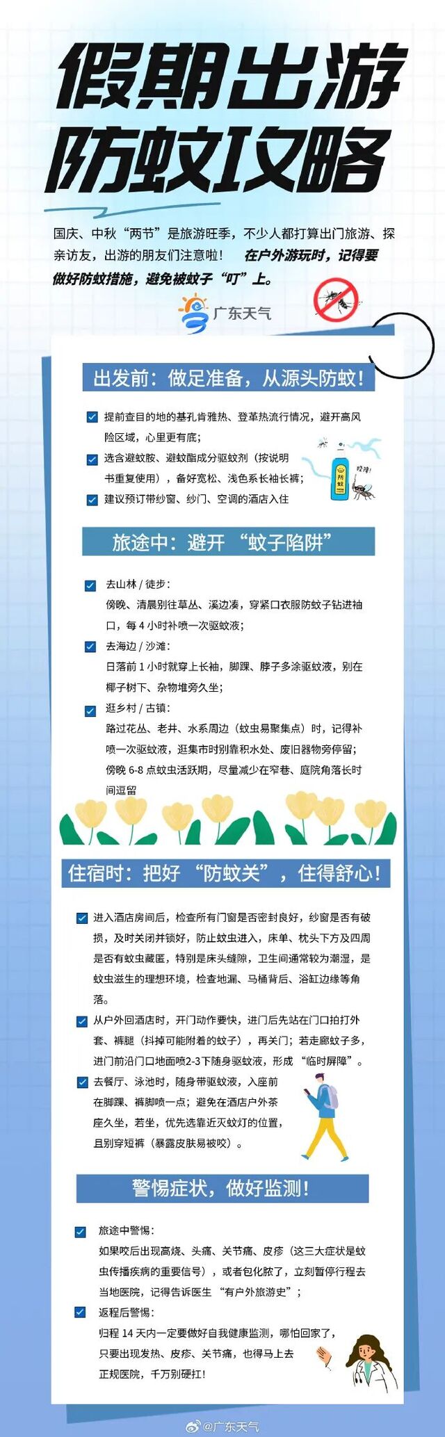 近期基孔肯雅热、登革热多发,请公众要积极行动起来,及时清理家中及周边积水,安装纱门纱窗或使用蚊帐。气温变化影响蚊子活跃度,尤其在早上7时至9时和傍晚17时至19时为伊蚊活动高峰,请做好防护措施,谨防蚊虫侵扰。