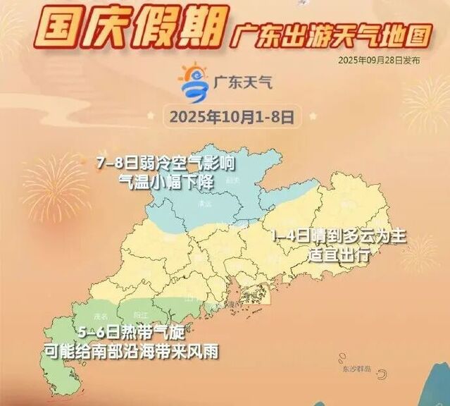预计,国庆和中秋假期前期(10月1-4日)广东省以晴到多云天气为主;中期(5-6日)热带气旋可能给我省南部市县和海面带来风雨影响;后期(7-8日),有弱冷空气南下影响我省,气温小幅下降,部分市县有阵雨。