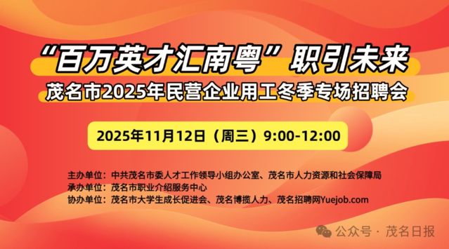 为深入贯彻“百万英才汇南粤”行动计划,满足茂名民营企业的用工需求,拟定于2025年11月12日(星期三)在茂名市人力资源和社会保障局二楼举办【“百万英才汇南粤”职引未来——茂名市2025年民营企业用工冬季专场招聘会】。