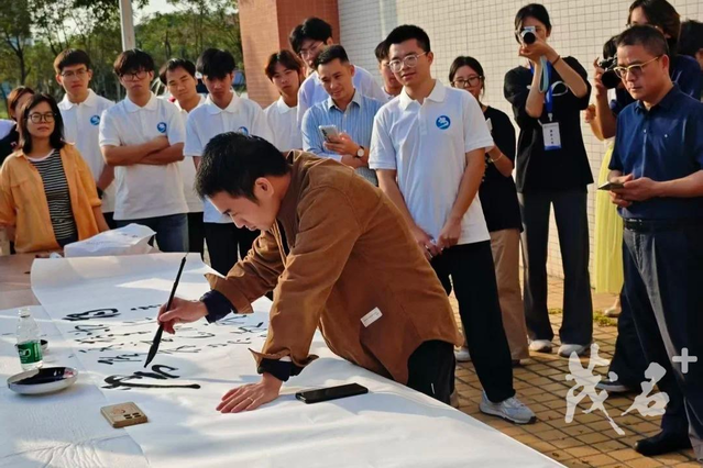 最后,各位书法家移步至广场,开展现场挥毫环节。他们挥洒自如、笔走龙蛇,一幅幅气势恢宏、意境深远的作品在现场师生的赞叹声中诞生,将整场活动的氛围推向高潮。