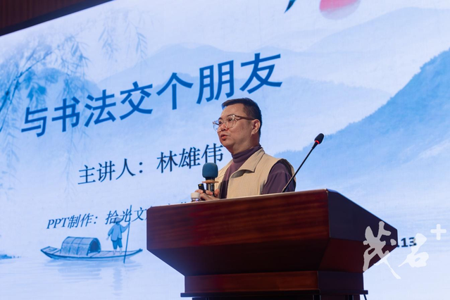 学院书法协会指导肖日增老师致辞,对茂名市青年书法家协会一行的到来表示热烈欢迎,并强调了书法艺术在高校美育教育中的重要意义。随后,茂名市青年书法家协会主席林雄伟先生以“与书法交个朋友”为主题,为在场师生带来一场精彩纷呈的书法艺术讲座。他结合自身多年的创作经验,深入浅出地讲解了书法的常识、书法艺术的底层逻辑等等,引导同学们在笔墨之间感受中华文化的博大精深。