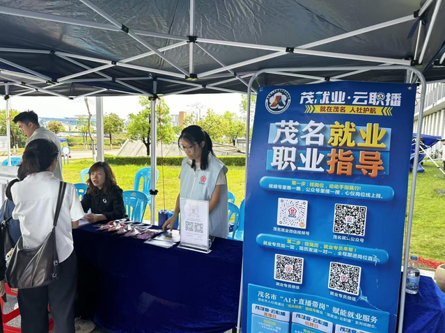 现场还设立了职业指导专区,为求职者提供贴心的职业指导与茂名就业平台指引服务,通过醒目的展板与二维码,向求职者全面介绍“茂就业·云职播”平台功能。据了解,“茂就业·云职播”作为茂名市人社局打造的“AI+直播带岗”服务品牌,不仅实现工作日常态化直播带岗,AI数字人“茂小职”更全年无休在线服务,真正打造“永不落幕的招聘会”。本次线下服务摊位的设置,进一步打通了线上线下服务壁垒,助力青年人才更好更快就业。